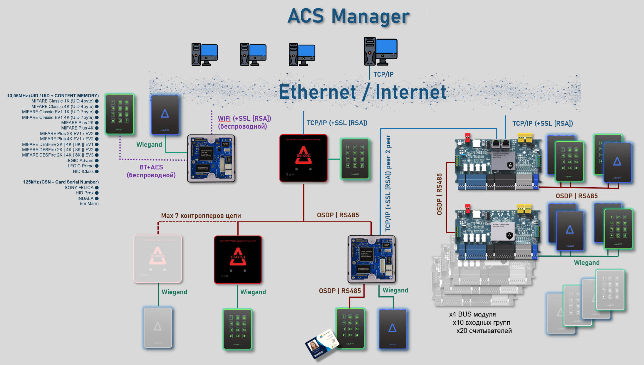 — IDETRIS 8XM *Master: (4 Считывателя / до 20 считывателей с использованием до 4 шт. 8BUS устройств расширения системы). - Три варианта использования контроллеров: Двери, Лифты, «Локеры».